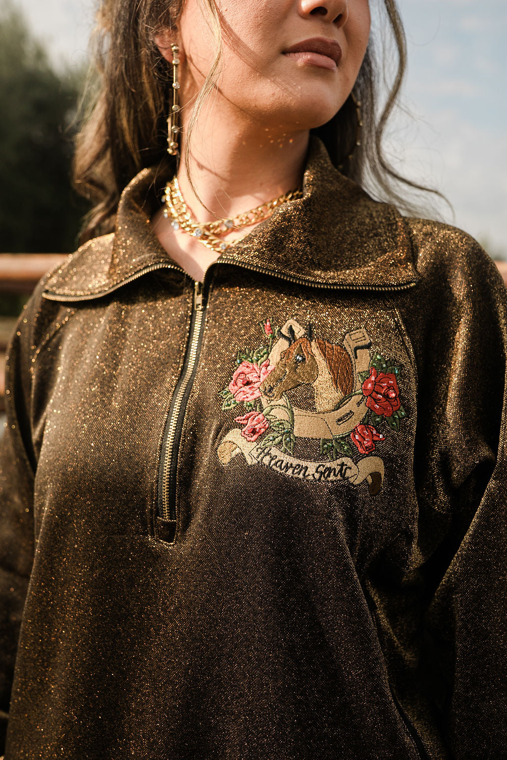 Made from ultra-soft, high-quality fabric with a hint of shimmer, it’s perfect for layering at the rodeo, running errands in town, or catching up with girlfriends under the Friday night lights. The bronzed finish adds just the right amount of sparkle — because every cowgirl deserves to shine