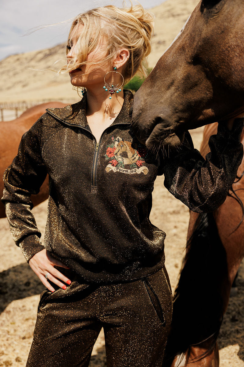 The Heaven Sent Top captures that perfect mix of grit and glam — a classic Western silhouette kissed with a metallic glow. Designed for the bold and spirited woman who isn’t afraid to stand out, this zip-up blends comfort with Rodeo Quincy’s signature flair.