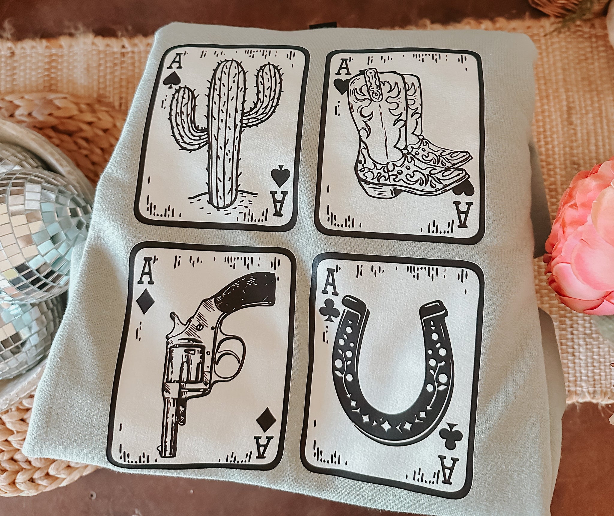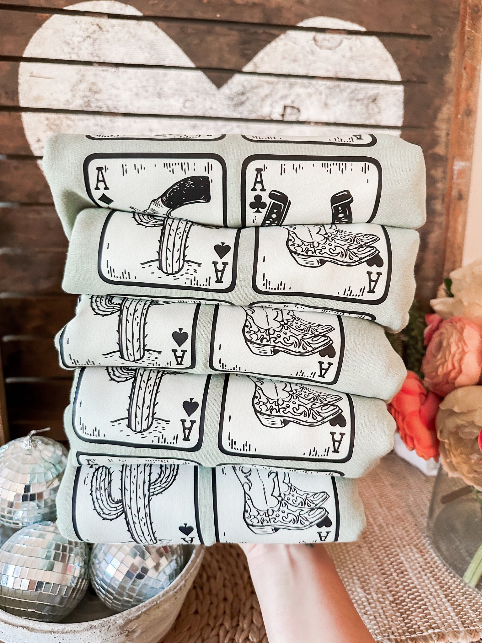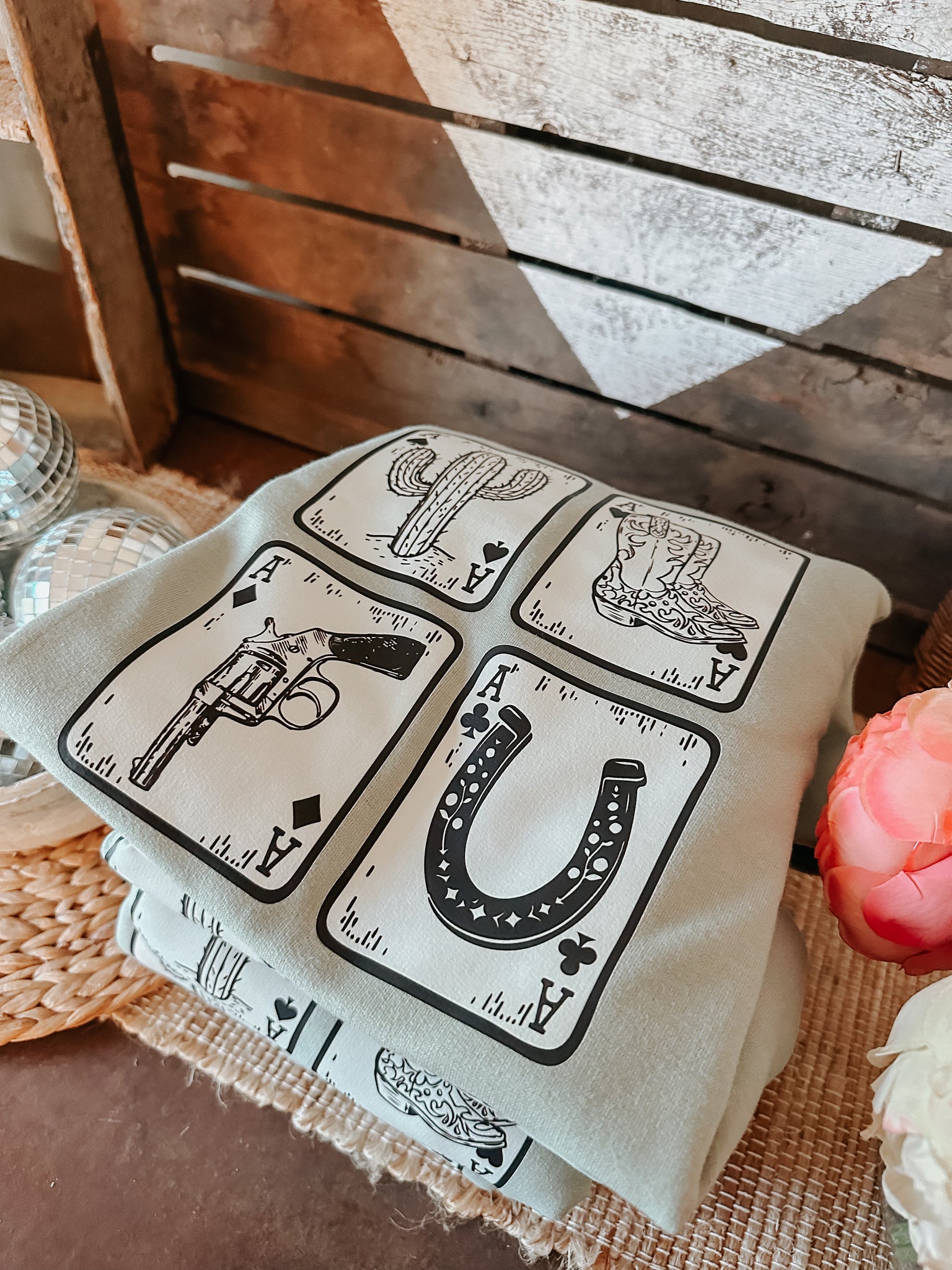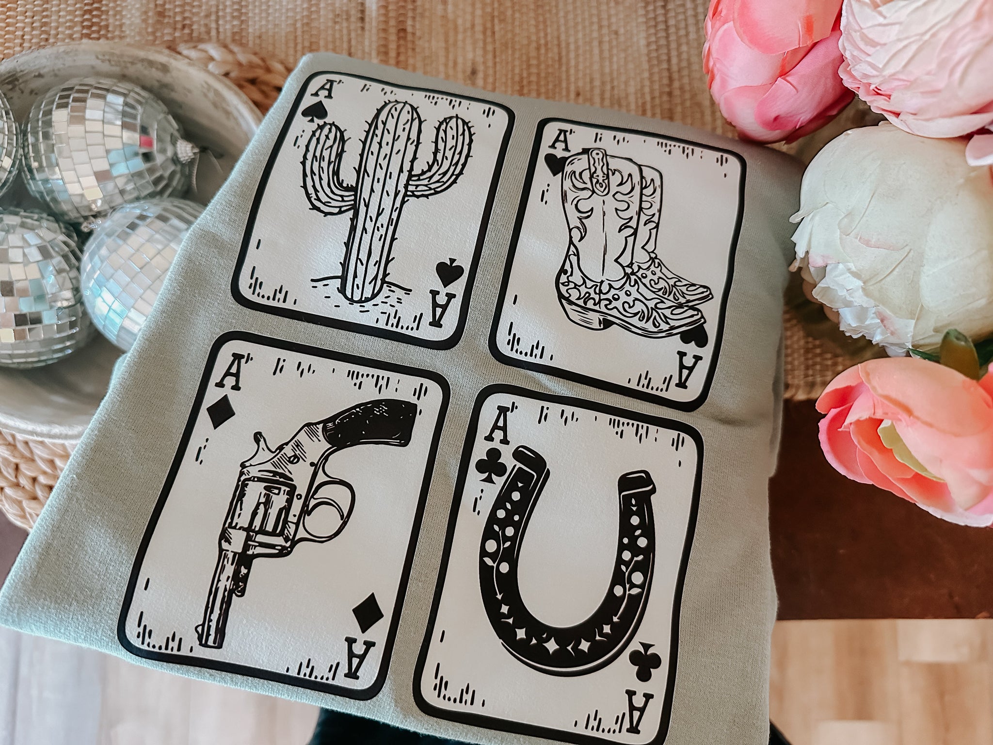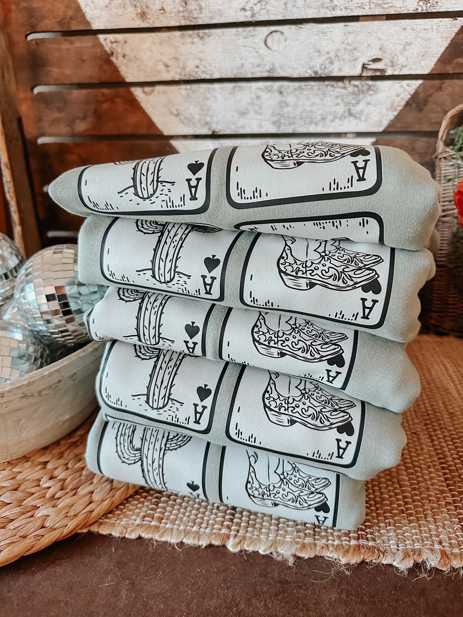Printed on a unisex fit dusty sage Gildan crew neck sweater.