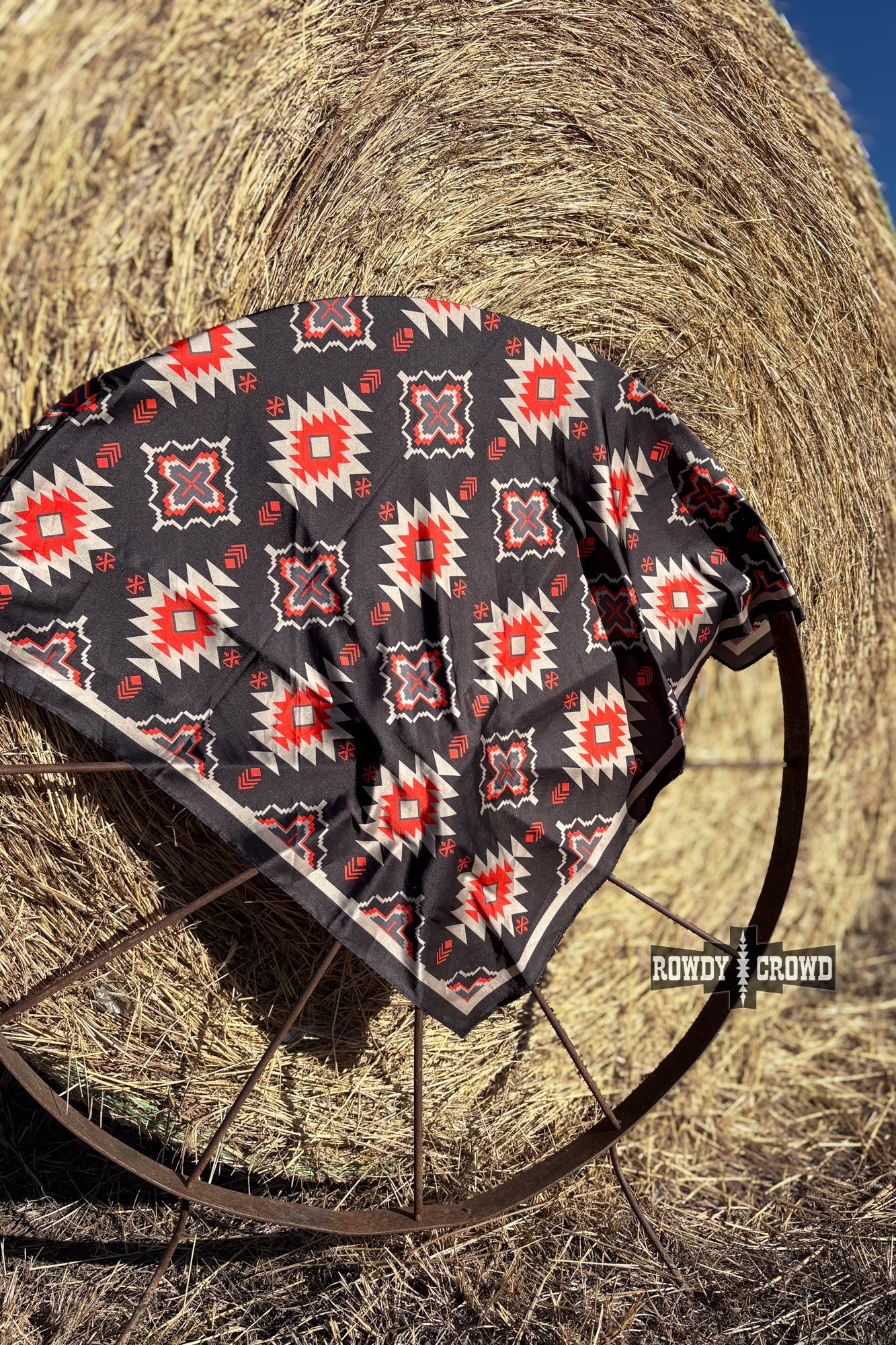 The Swift Creek Wild Rag brings bold, classic western style with a sharp modern edge. Its rich black base is covered in striking red, tan, and cream Aztec motifs that pop without overpowering- perfect for the cowgirl who likes a little drama in her wardrobe. The silky feel and generous size make it easy to tie, layer, and style however you please.